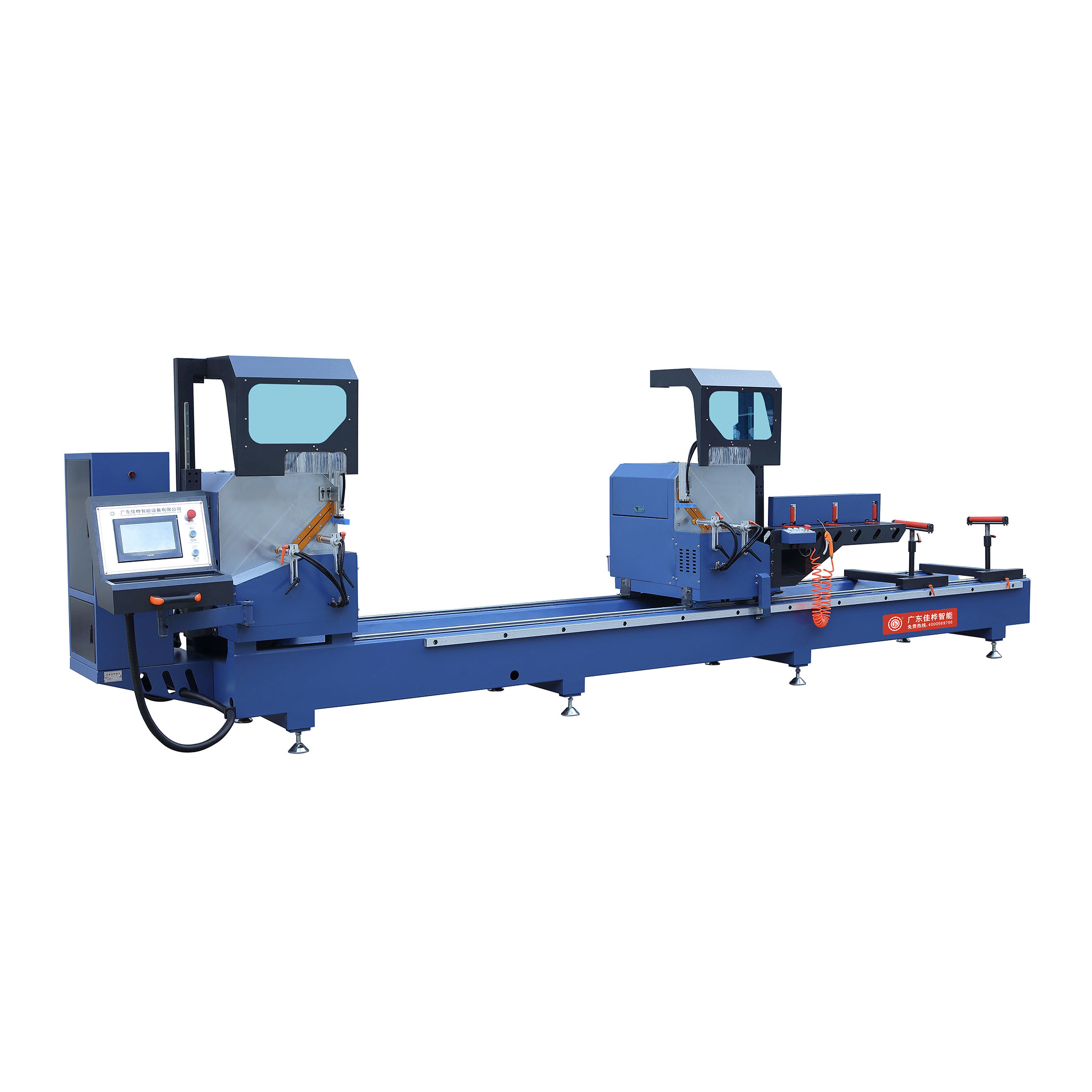 用于鋁門(mén)窗及幕墻型材的切割。給系統(tǒng)采用進(jìn)口直線導(dǎo)軌副,精度高、壽命長(zhǎng)。氣液阻尼缸保證鋸片進(jìn)給均勻,運(yùn)動(dòng)平穩(wěn)?;顒?dòng)機(jī)頭移動(dòng)采用大導(dǎo)程滾珠絲杠運(yùn)動(dòng)形式,傳動(dòng)精度高,定位準(zhǔn)確,工作平穩(wěn)。采用數(shù)控技術(shù)可完成不同規(guī)格尺寸的型材自動(dòng)下料,實(shí)現(xiàn) 外45度和90度型材的角度切割。